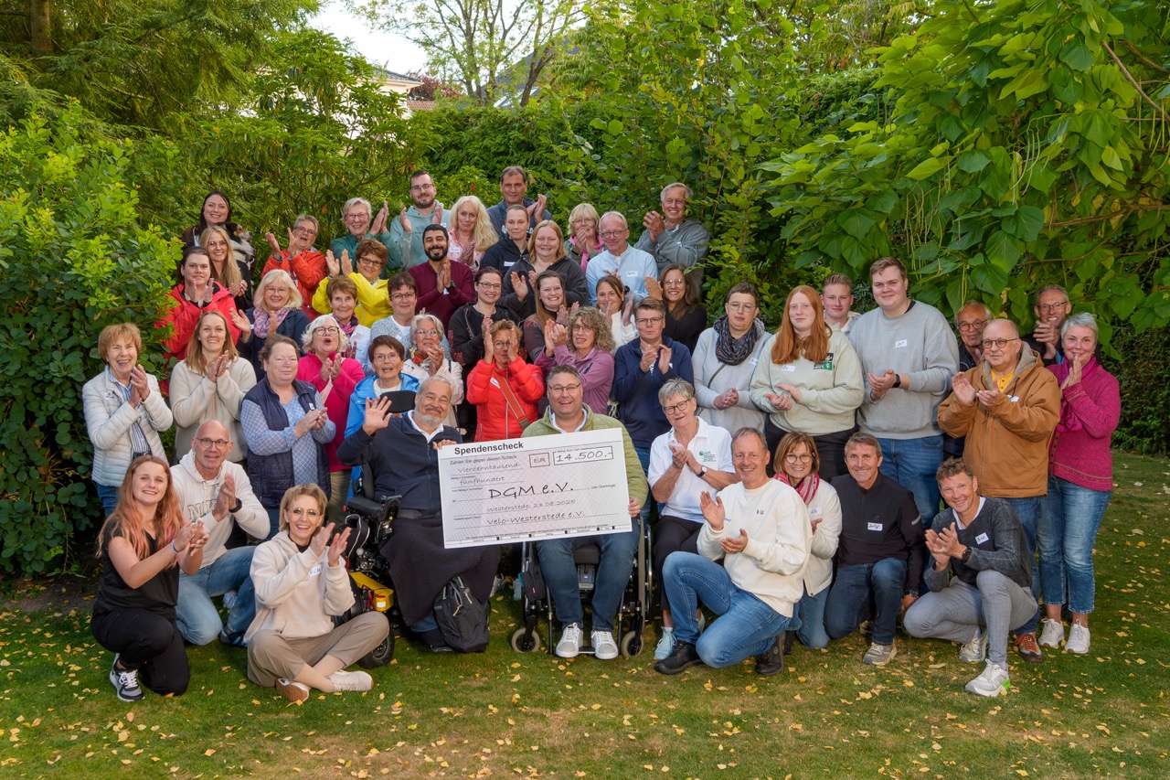 Am 23. August gab es nun ein Dankeschön-Fest in Westerstede für alle Mitarbeitenden und ehrenamtlich Helfenden. Im Garten von Hilke und Gerhard Sander fand zu diesem Anlaß auch die Scheckübergabe statt. Das ist immer ein spannender Moment. Nachdem Hilke noch einmal die vielen Stationen und Menschen, die dort garbeitet haben, vorgestellt hatte, enthüllte Gerhard unter großem Applaus den Scheck: 14.500 € für die Arbeit in unserem Landesverband!! Das ist grandios!